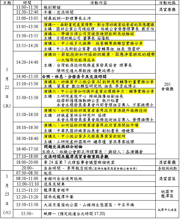 一、本會為協助會員與紡織相關廠商之經營管理、研發及行銷幹部,因應當前產業情勢開創新局、善用政府資源轉型升級、節能降成本、導入AI創新應用、提升廠務技術、開拓市場及永續競爭力,特邀相關專家與標竿企業代表蒞臨講授,於5月22、23日(星期五、六)假龍潭渴望會館舉辦「紡織業經營管理、研發及行銷幹部研習聯誼活動」,5月22日下午將安排八場難得的演講活動,由郭理事長正沛主持,並邀請各演講者共同進行問題研討。
