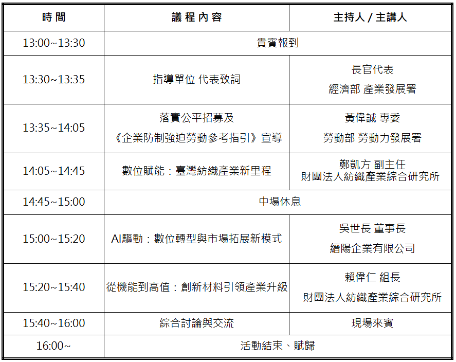 為了掌握產業發展契機,我們必須利用臺灣機能性布料的研發優勢,加速數位轉型與高值化發展,並擴大跨領域應用以重塑產業新價值,進而建立不可替代的技術門檻,轉型為具備「戰略彈性」的供應夥伴。為此,產發署委託紡織所舉辦本次交流會,協助業者重塑競爭力思維、優化整體布局,以精準應對日益複雜的國際經貿環境。本次活動將聚焦: