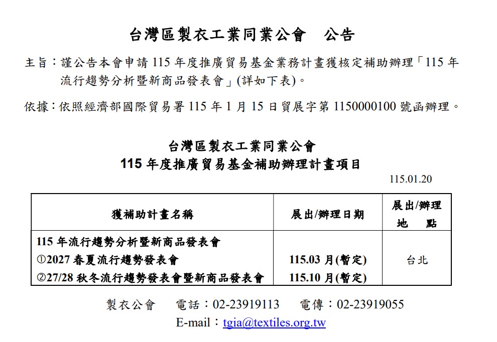 【本會公告】本會申請115年度推廣貿易基金業務計畫獲核定補助辦理「115年流行趨勢分析暨新商品發表會」