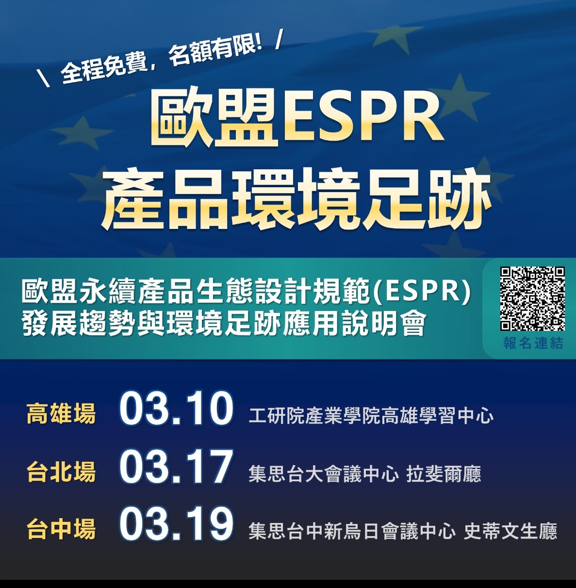 有鑑於此,本計畫規劃辦理3場次「歐盟永續產品生態設計規範(ESPR)發展趨勢與環境足跡應用說明會」。包含技術理念的傳達、執行方法概述及國際趨勢等內容,期能擴大產業未來之接受性及實踐性。為鼓勵女性從業人員投入永續行動,落實國家性別平等政策,本活動鼓勵女性從業人員報名參與。