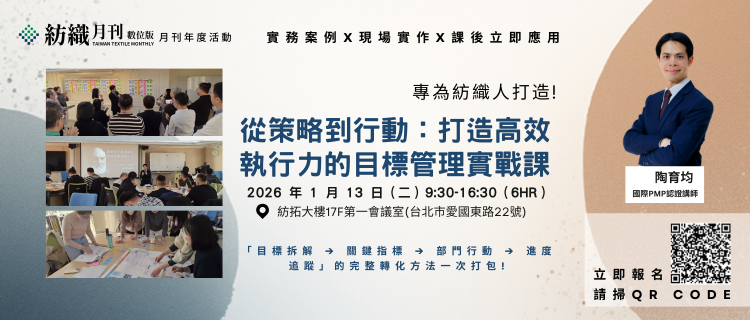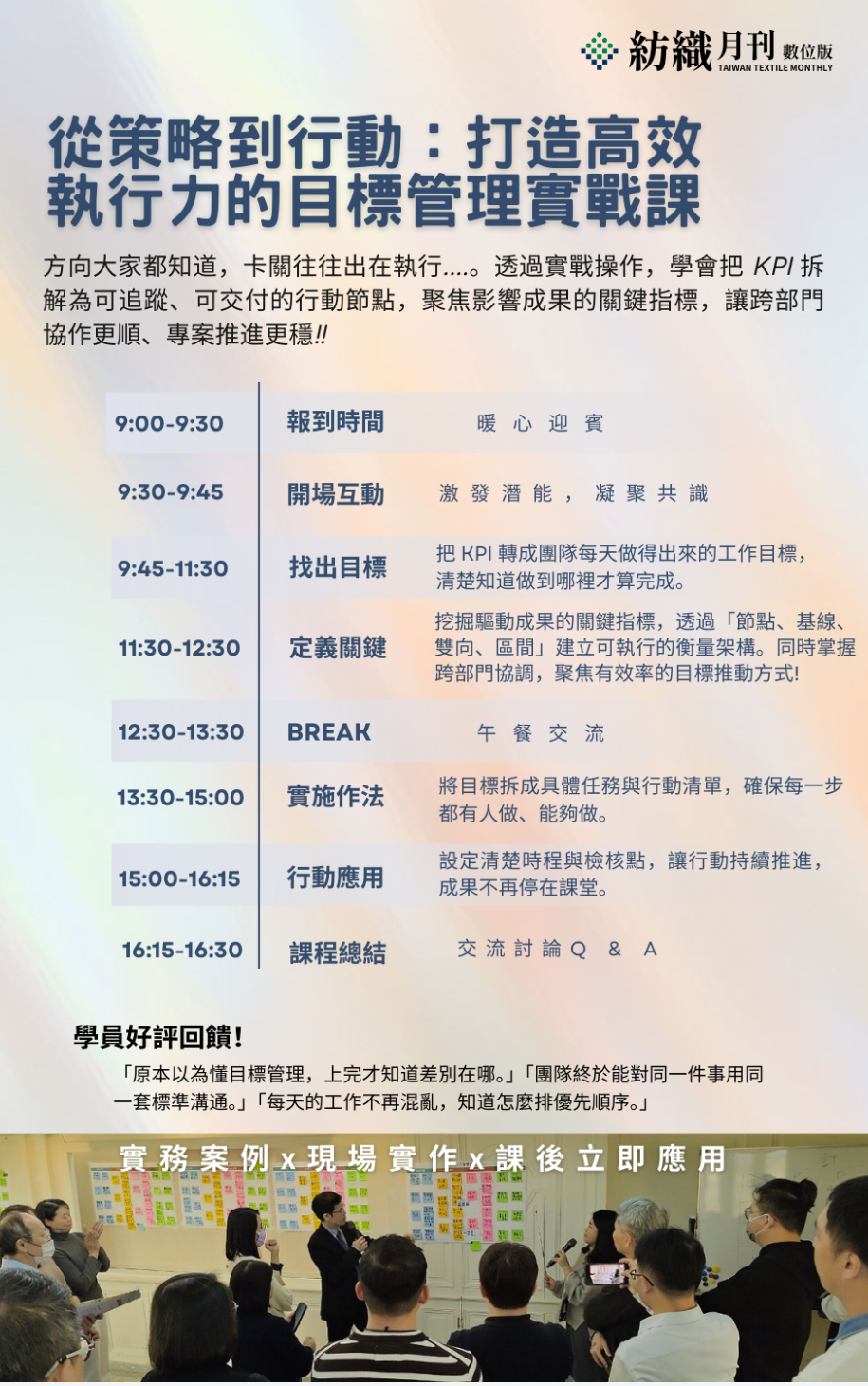 這堂高效管理術課程,從紡織業每天要面對的訂單、交期與跨部門溝通出發,教你把原本只存在會議裡的目標與策略,拆成每天真的做得完的關鍵行動。透過實用的專案管理工具,讓業務、跟單、研發、採購之間的節奏對得起來,不再各忙各的、卻還是趕不上交期。幫助個人與團隊跳脫「一直在忙卻看不到成果」的狀態,讓每一步工作都對進度有貢獻,在市場變化快速的情況下,也能清楚掌握現在該先做什麼。