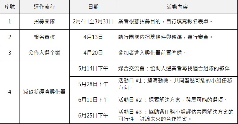 本次的「減碳新經濟孵化器」期待招募紡織相關業者,探索、發想及共創具發展潛力的智慧化、低碳化循環紡織服務或商業模式,並達成以下目的: